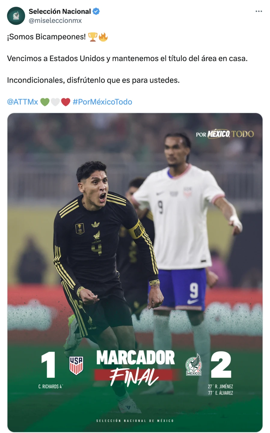 El tanto definitivo cayó en los últimos minutos del partido. Un centro de Alexis Vega fue mal despejado por la defensa estadounidense, y el balón quedó servido para que el capitán Edson Álvarez rematara con precisión para firmar el 2-1 final, jugada que fue validada por el VAR.