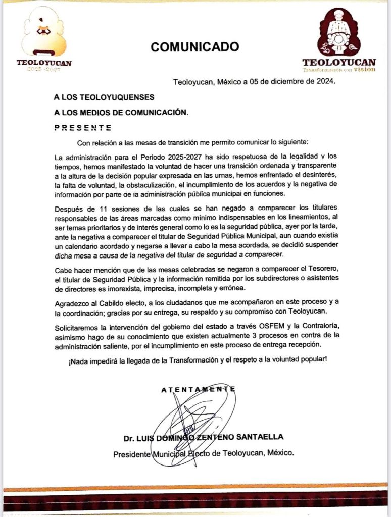 La administración electa para el periodo 2025-2027 de Teoloyucan ha expresado su compromiso con una transición ordenada y transparente, respetando los tiempos establecidos y la voluntad popular expresada en las urnas. Sin embargo, han enfrentado múltiples obstáculos por parte de la administración saliente.
