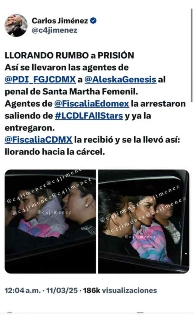 La modelo e influencer venezolana Aleska Génesis fue detenida en México después de ser eliminada del reality show La Casa de los Famosos All Stars de Telemundo. Según reportes de la Fiscalía del Estado de México, la influencer fue capturada mientras abandonaba el lugar donde se graba el programa. La detención se produjo debido a una orden de aprehensión emitida por la Fiscalía de la Ciudad de México, que la acusa de estar involucrada en un robo de relojes de lujo.