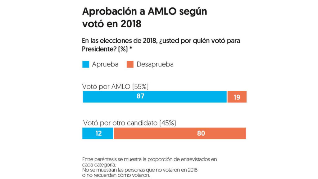 De acuerdo con el sondeo de junio, entre las personas entrevistadas que dijeron haber votado por López Obrador en las elecciones de 2018, 87 por ciento aprueba la labor que está haciendo el mandatario, mientras que 12 por ciento lo desaprueba.