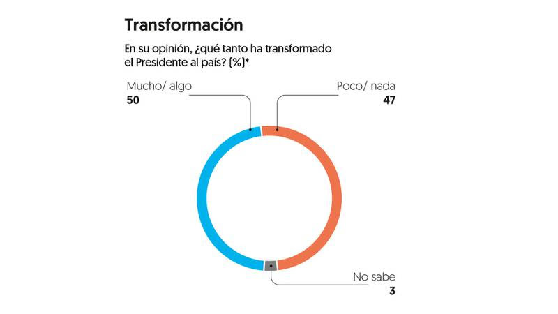 Asimismo, al preguntar qué tanto ha transformado el presidente López Obrador al país, 50 por ciento respondió mucho o algo, mientras que 47 por ciento dijo que poco o nada.