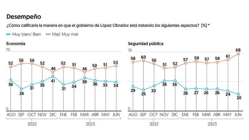 Lo mejor evaluado son los apoyos sociales que, no obstante, registraron una baja en las opiniones positivas en el último mes, al pasar de 49 a 44 por ciento, mientras que las opiniones negativas subieron de 30 a 37 por ciento.