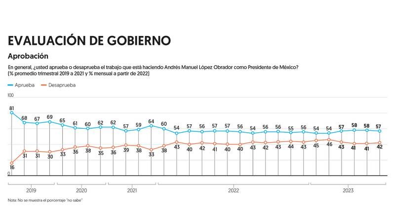 La aprobación ciudadana del presidente López Obrador se mantuvo estable en el mes de junio, con un registro del 57 por ciento, una minúscula variación de un punto porcentual respecto a los dos meses previos, cuando el nivel de aprobación fue de 58 por ciento, así lo revela la más reciente encuesta nacional de El Financiero.