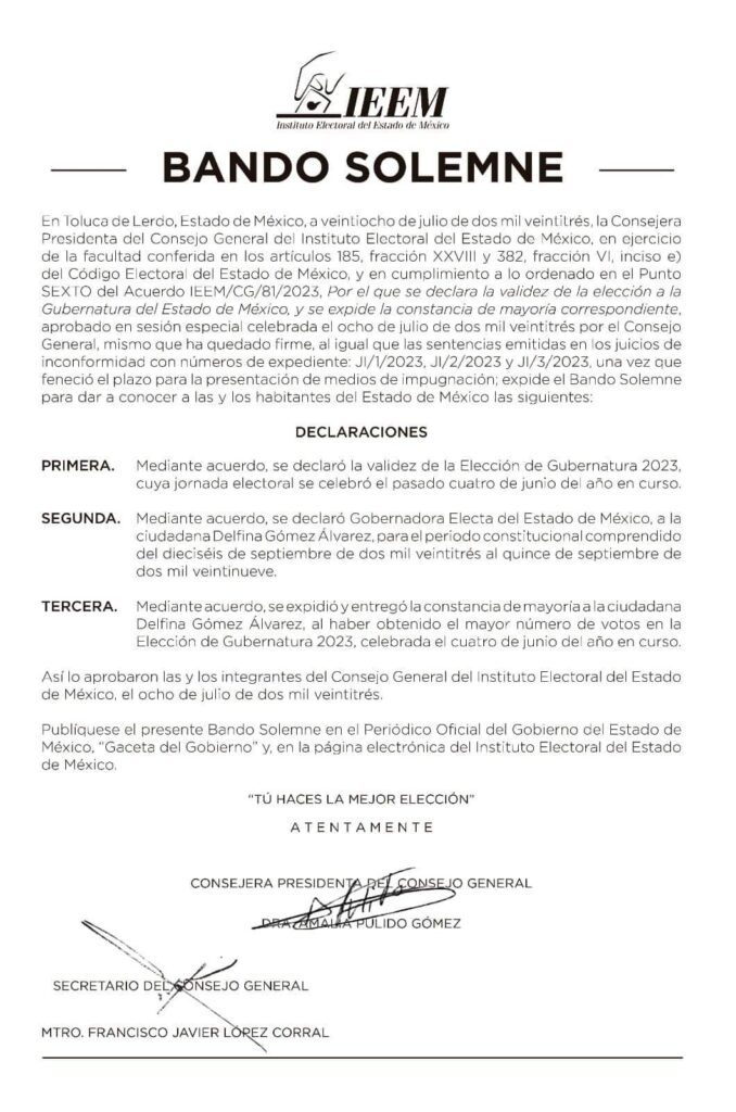 El Instituto Electoral del Estado de México (IEEM) expidió el Bando Solemne para dar a conocer que su Consejo General declara Gobernadora Electa del Estado de México a Delfina Gómez Álvarez.