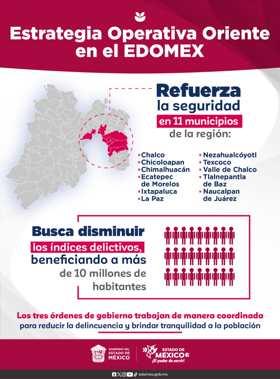 Por iniciativa de la Gobernadora del Estado de México, Delfina Gómez Álvarez, y con el respaldo de la Dra. Claudia Sheinbaum Pardo, Presidenta de la República, se lanzó oficialmente la Estrategia Operativa Oriente, una acción integral enfocada en fortalecer la seguridad en esta importante región del Estado de México. Con la participación y coordinación de los presidentes municipales de 11 municipios de la zona, esta estrategia busca combatir la inseguridad, garantizar el bienestar de la ciudadanía y mejorar la calidad de vida de los habitantes.