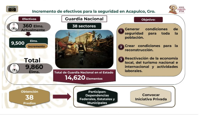 Sobre el plan de seguridad para Acapulco, Guerrero, el titular de la Secretaría de la Defensa Nacional (Sedena), Luis Cresencio Sandoval, informó que la meta es que la Guardia Nacional sea responsable de la seguridad pública de esa región de forma permanente.