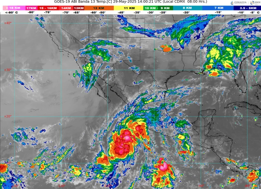 Asimismo, se prevé oleaje elevado en zonas costeras: de 2 a 3 metros en Jalisco, Colima y Michoacán, y de 1 a 2 metros en Guerrero.